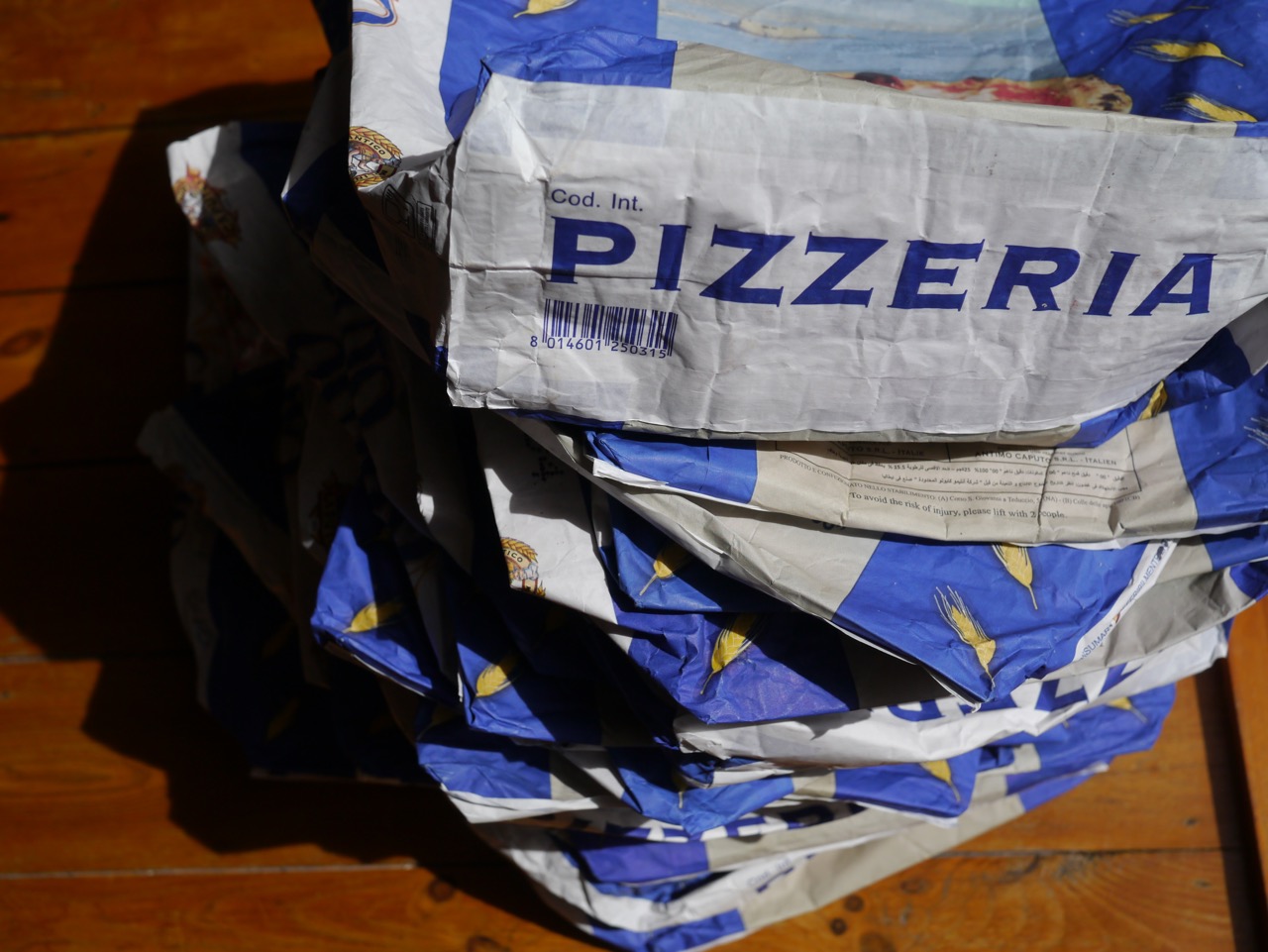 Rather than put the bags out with the recycling we started collecting a sack here and there. I counted them today and there’re 26. Over half a tonne’s worth stashed away in a cupboard. If all goes to plan we’ll decorate a section of the wall with them. Wallpaper with meaning.